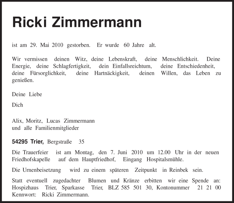 Hier finden Sie alle Traueranzeigen aus der Zeitung, die bisher für Ricki Zimmermann erschienen sind. Weitere Traueranzeigen, die in der Zeitung erscheinen, werden hier ebenfalls aufgelistet