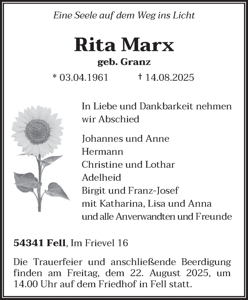 Hier finden Sie alle Traueranzeigen aus der Zeitung, die bisher für Rita Marx erschienen sind. Weitere Traueranzeigen, die in der Zeitung erscheinen, werden hier ebenfalls aufgelistet