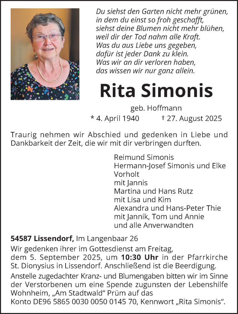 Hier finden Sie alle Traueranzeigen aus der Zeitung, die bisher für Rita Simonis erschienen sind. Weitere Traueranzeigen, die in der Zeitung erscheinen, werden hier ebenfalls aufgelistet