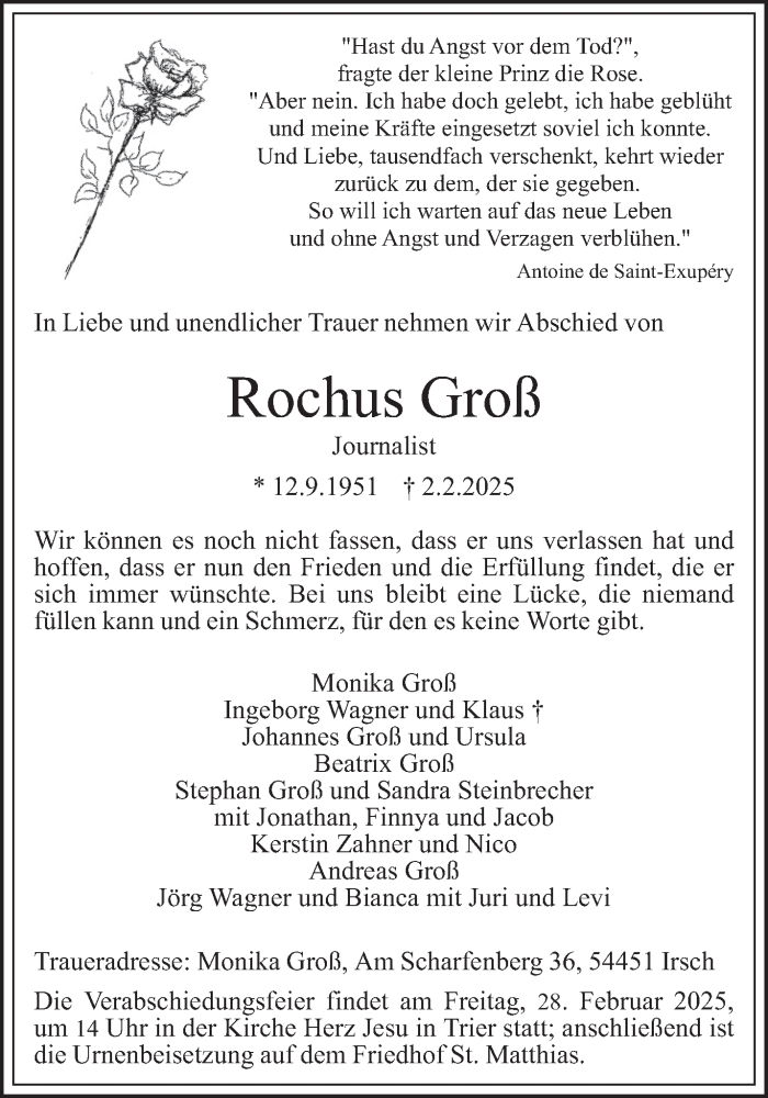 Hier finden Sie alle Traueranzeigen aus der Zeitung, die bisher für Rochus Groß erschienen sind. Weitere Traueranzeigen, die in der Zeitung erscheinen, werden hier ebenfalls aufgelistet
