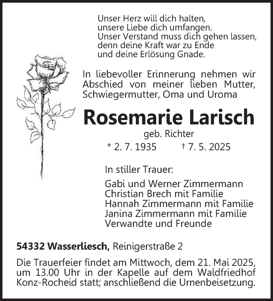 Hier finden Sie alle Traueranzeigen aus der Zeitung, die bisher für Rosemarie Larisch erschienen sind. Weitere Traueranzeigen, die in der Zeitung erscheinen, werden hier ebenfalls aufgelistet
