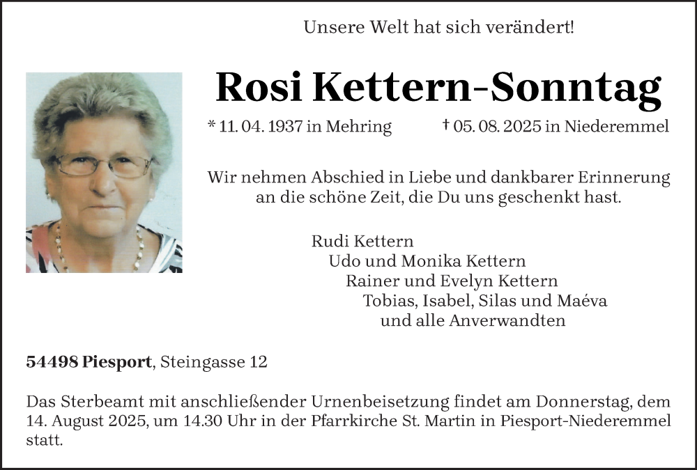 Hier finden Sie alle Traueranzeigen aus der Zeitung, die bisher für Rosi Kettern-Sonntag erschienen sind. Weitere Traueranzeigen, die in der Zeitung erscheinen, werden hier ebenfalls aufgelistet