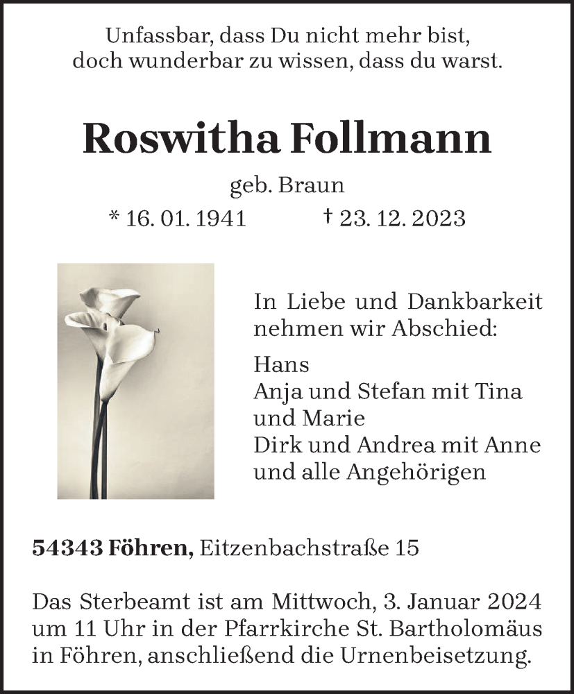 Hier finden Sie alle Traueranzeigen aus der Zeitung, die bisher für Roswitha Follmann erschienen sind. Weitere Traueranzeigen, die in der Zeitung erscheinen, werden hier ebenfalls aufgelistet