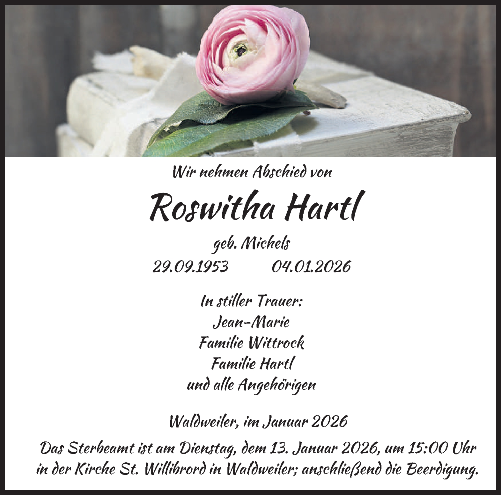 Hier finden Sie alle Traueranzeigen aus der Zeitung, die bisher für Roswitha Hartl erschienen sind. Weitere Traueranzeigen, die in der Zeitung erscheinen, werden hier ebenfalls aufgelistet