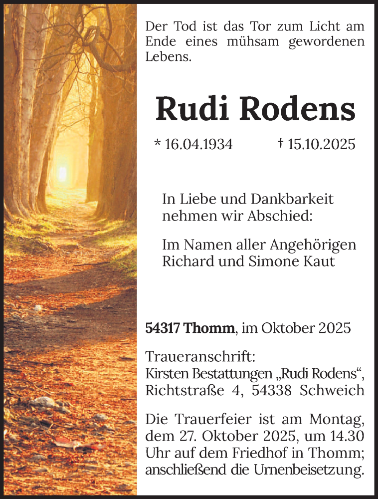 Hier finden Sie alle Traueranzeigen aus der Zeitung, die bisher für Rudi Rodens erschienen sind. Weitere Traueranzeigen, die in der Zeitung erscheinen, werden hier ebenfalls aufgelistet