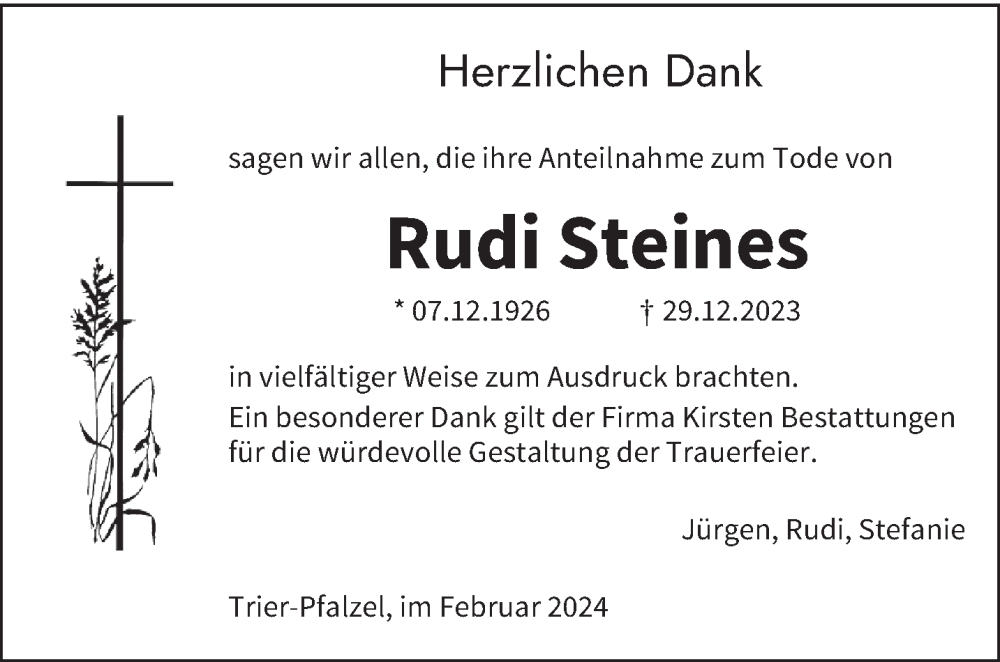 Hier finden Sie alle Traueranzeigen aus der Zeitung, die bisher für Rudi Steines erschienen sind. Weitere Traueranzeigen, die in der Zeitung erscheinen, werden hier ebenfalls aufgelistet