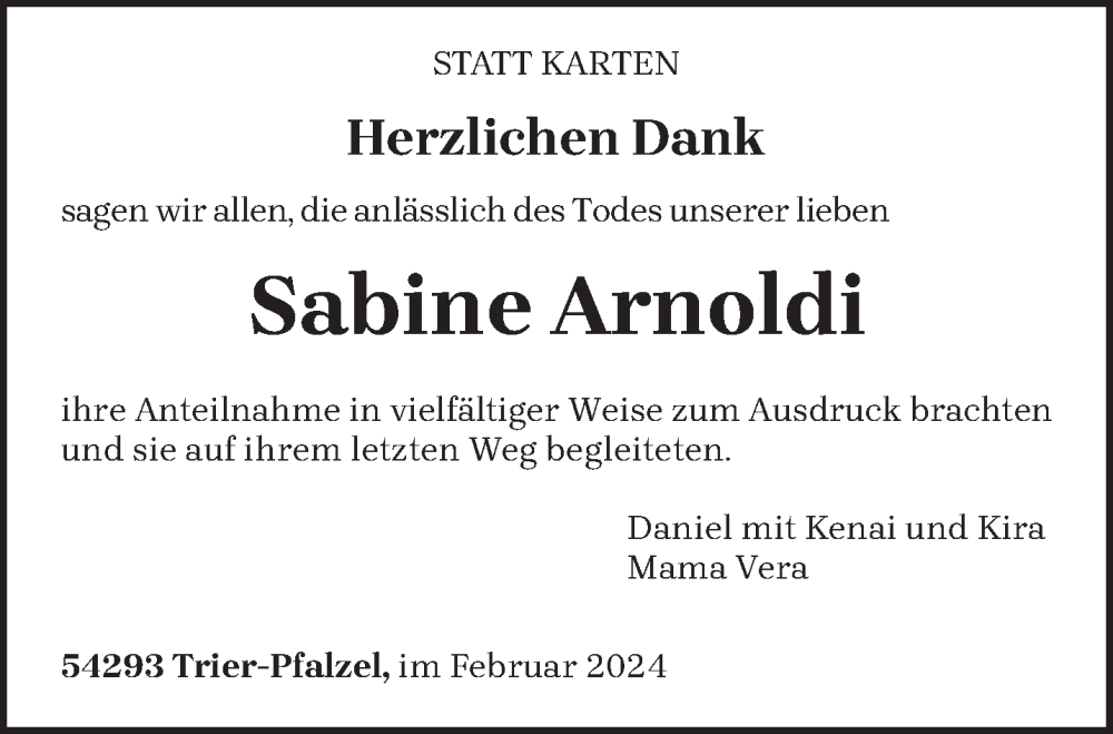 Hier finden Sie alle Traueranzeigen aus der Zeitung, die bisher für Sabine Arnoldi erschienen sind. Weitere Traueranzeigen, die in der Zeitung erscheinen, werden hier ebenfalls aufgelistet