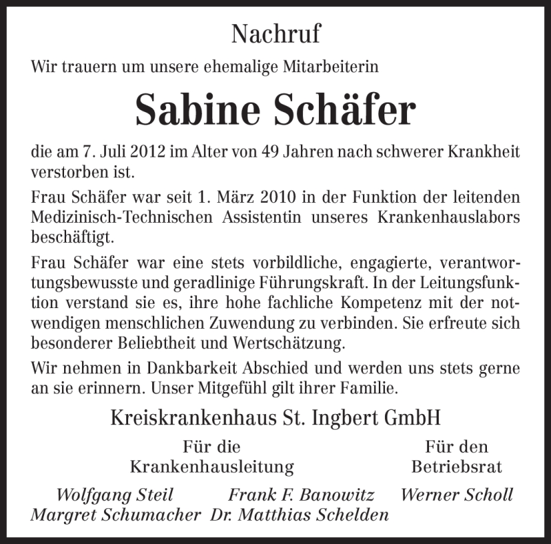 Hier finden Sie alle Traueranzeigen aus der Zeitung, die bisher für Sabine Schäfer erschienen sind. Weitere Traueranzeigen, die in der Zeitung erscheinen, werden hier ebenfalls aufgelistet
