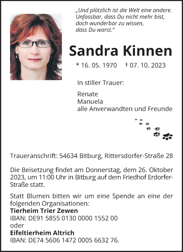 Hier finden Sie alle Traueranzeigen aus der Zeitung, die bisher für Sandra Kinnen erschienen sind. Weitere Traueranzeigen, die in der Zeitung erscheinen, werden hier ebenfalls aufgelistet