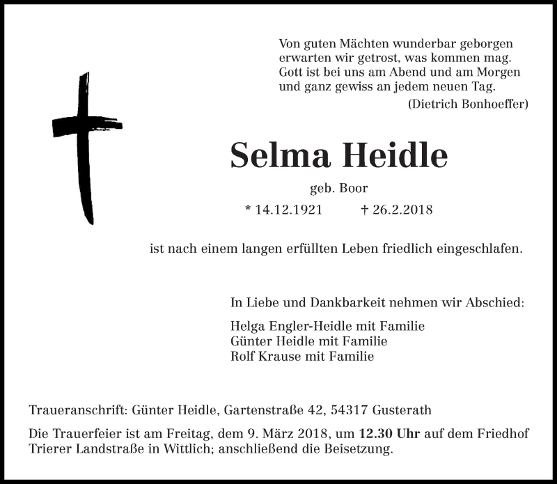 Hier finden Sie alle Traueranzeigen aus der Zeitung, die bisher für Selma Heidle erschienen sind. Weitere Traueranzeigen, die in der Zeitung erscheinen, werden hier ebenfalls aufgelistet