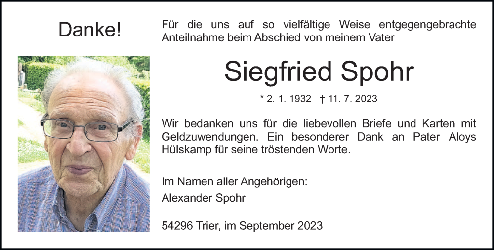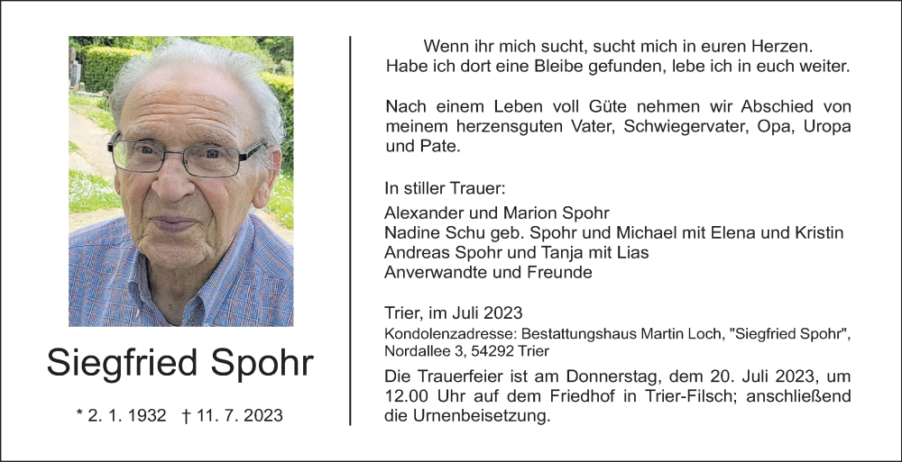 Hier finden Sie alle Traueranzeigen aus der Zeitung, die bisher für Siegfried Spohr erschienen sind. Weitere Traueranzeigen, die in der Zeitung erscheinen, werden hier ebenfalls aufgelistet