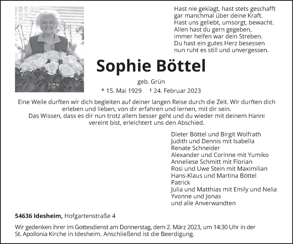Hier finden Sie alle Traueranzeigen aus der Zeitung, die bisher für Sophie Böttel erschienen sind. Weitere Traueranzeigen, die in der Zeitung erscheinen, werden hier ebenfalls aufgelistet