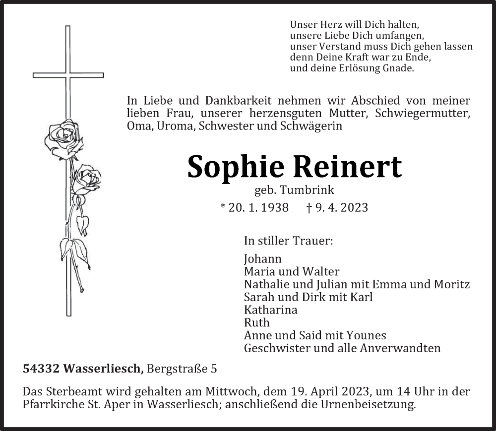 Hier finden Sie alle Traueranzeigen aus der Zeitung, die bisher für Sophie Reinert erschienen sind. Weitere Traueranzeigen, die in der Zeitung erscheinen, werden hier ebenfalls aufgelistet