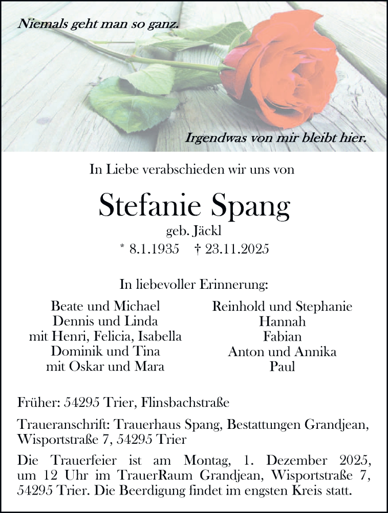 Hier finden Sie alle Traueranzeigen aus der Zeitung, die bisher für Stefanie Spang erschienen sind. Weitere Traueranzeigen, die in der Zeitung erscheinen, werden hier ebenfalls aufgelistet