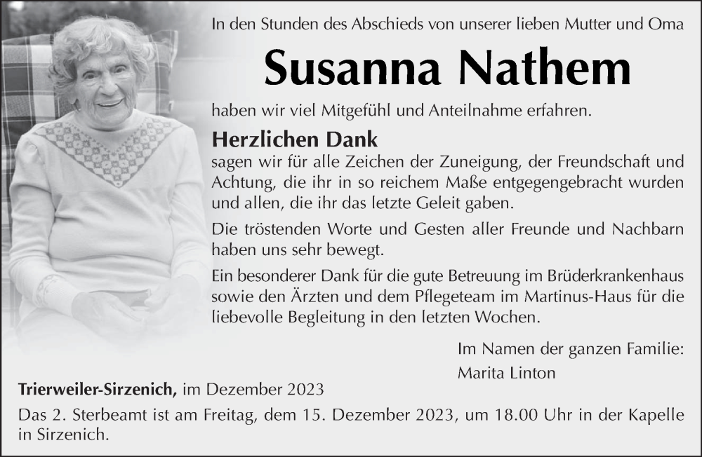 Hier finden Sie alle Traueranzeigen aus der Zeitung, die bisher für Susanna Nathem erschienen sind. Weitere Traueranzeigen, die in der Zeitung erscheinen, werden hier ebenfalls aufgelistet