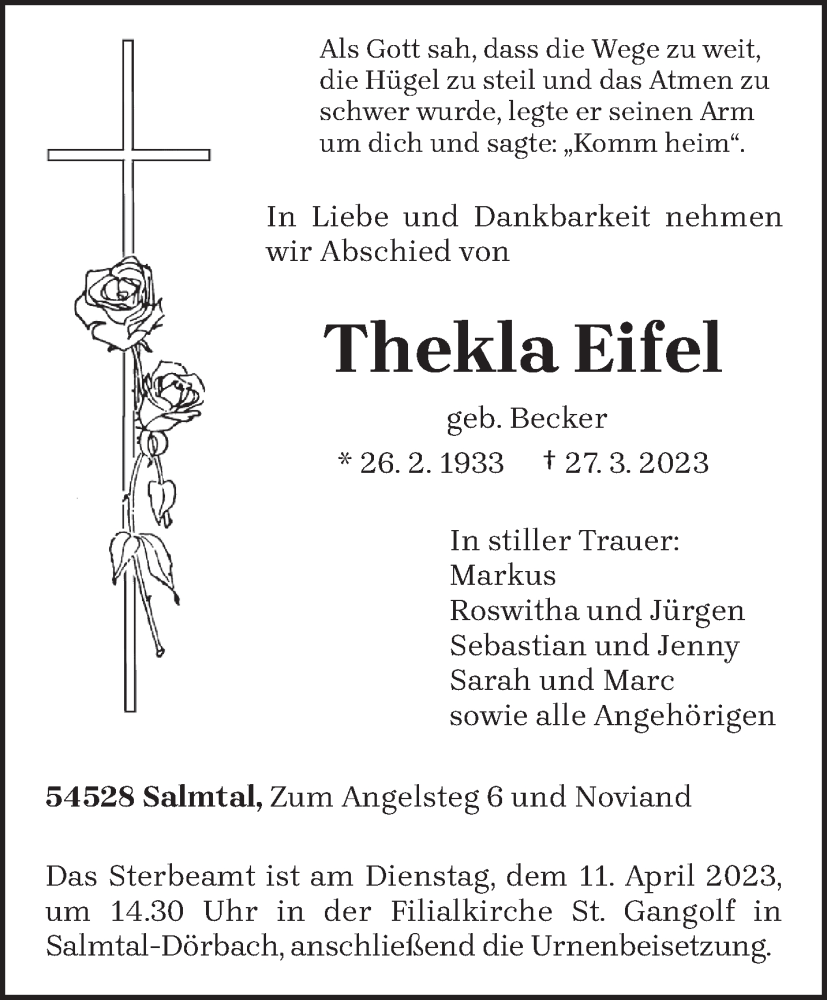Hier finden Sie alle Traueranzeigen aus der Zeitung, die bisher für Thekla Eifel erschienen sind. Weitere Traueranzeigen, die in der Zeitung erscheinen, werden hier ebenfalls aufgelistet