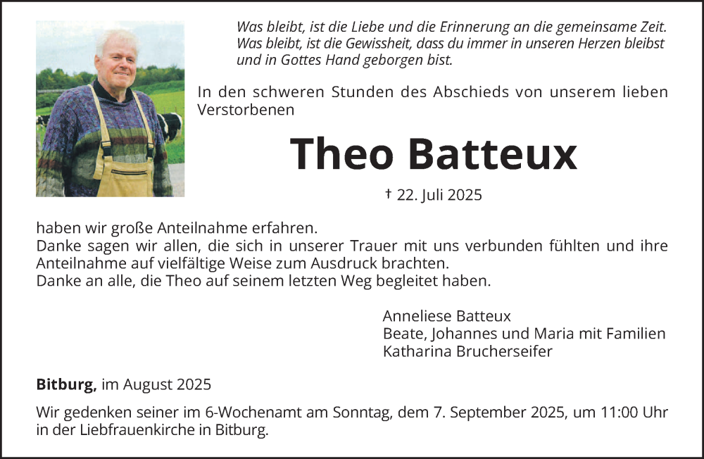 Hier finden Sie alle Traueranzeigen aus der Zeitung, die bisher für Theo Batteux erschienen sind. Weitere Traueranzeigen, die in der Zeitung erscheinen, werden hier ebenfalls aufgelistet