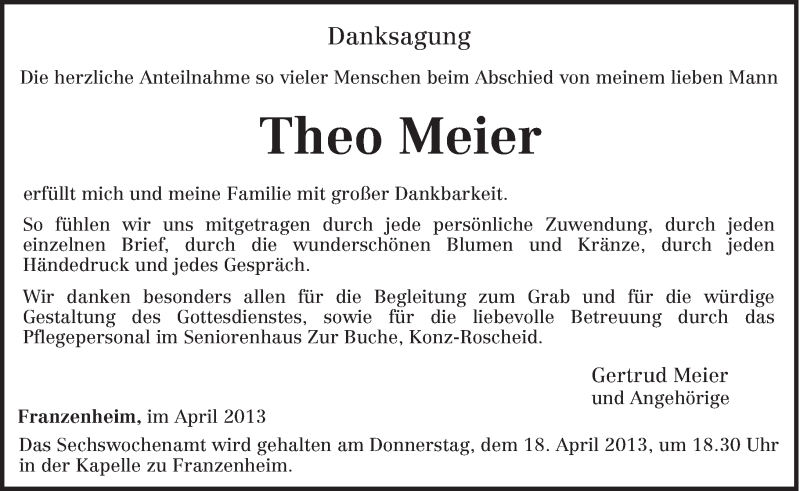 Hier finden Sie alle Traueranzeigen aus der Zeitung, die bisher für Theo Meier erschienen sind. Weitere Traueranzeigen, die in der Zeitung erscheinen, werden hier ebenfalls aufgelistet