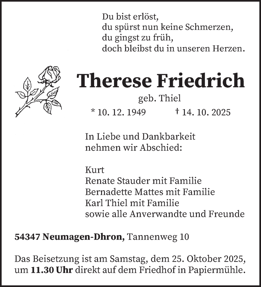 Hier finden Sie alle Traueranzeigen aus der Zeitung, die bisher für Therese Friedrich erschienen sind. Weitere Traueranzeigen, die in der Zeitung erscheinen, werden hier ebenfalls aufgelistet