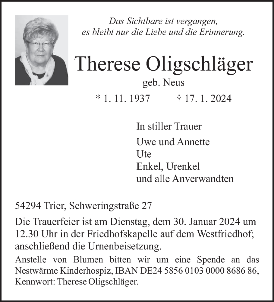 Hier finden Sie alle Traueranzeigen aus der Zeitung, die bisher für Therese Oligschläger erschienen sind. Weitere Traueranzeigen, die in der Zeitung erscheinen, werden hier ebenfalls aufgelistet