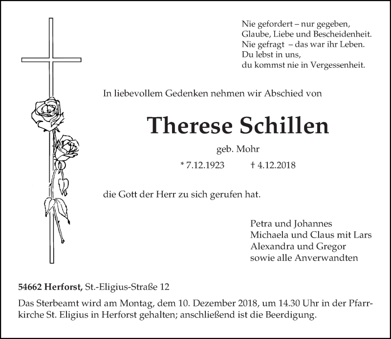 Hier finden Sie alle Traueranzeigen aus der Zeitung, die bisher für Therese Schillen erschienen sind. Weitere Traueranzeigen, die in der Zeitung erscheinen, werden hier ebenfalls aufgelistet