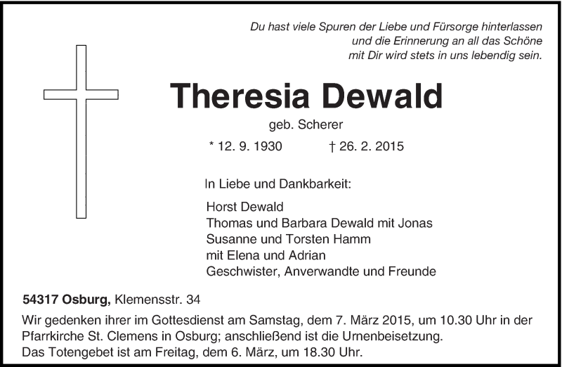 Hier finden Sie alle Traueranzeigen aus der Zeitung, die bisher für Theresia Dewald erschienen sind. Weitere Traueranzeigen, die in der Zeitung erscheinen, werden hier ebenfalls aufgelistet