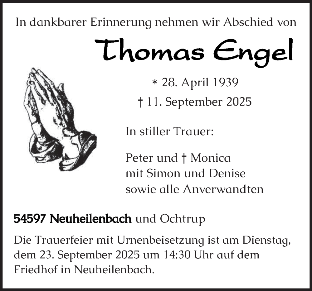 Hier finden Sie alle Traueranzeigen aus der Zeitung, die bisher für Thomas Engel erschienen sind. Weitere Traueranzeigen, die in der Zeitung erscheinen, werden hier ebenfalls aufgelistet