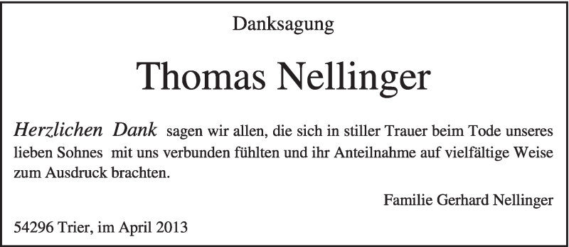 Hier finden Sie alle Traueranzeigen aus der Zeitung, die bisher für Thomas Nellinger erschienen sind. Weitere Traueranzeigen, die in der Zeitung erscheinen, werden hier ebenfalls aufgelistet
