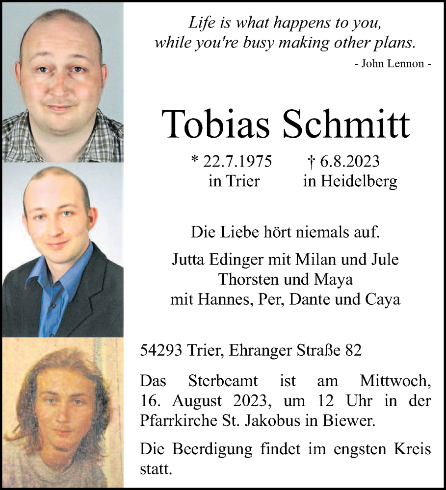 Hier finden Sie alle Traueranzeigen aus der Zeitung, die bisher für Tobias Schmitt erschienen sind. Weitere Traueranzeigen, die in der Zeitung erscheinen, werden hier ebenfalls aufgelistet