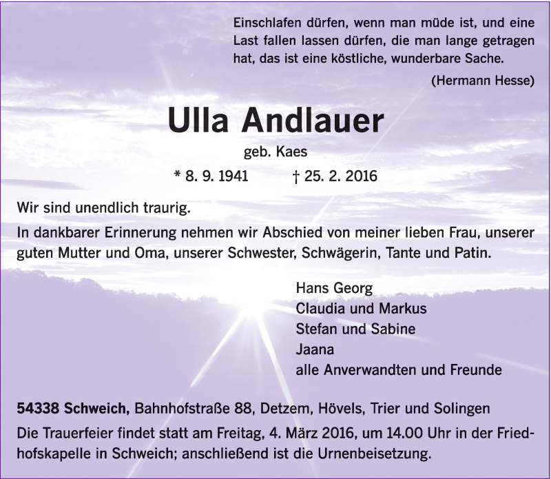Hier finden Sie alle Traueranzeigen aus der Zeitung, die bisher für Ulla Andlauer erschienen sind. Weitere Traueranzeigen, die in der Zeitung erscheinen, werden hier ebenfalls aufgelistet