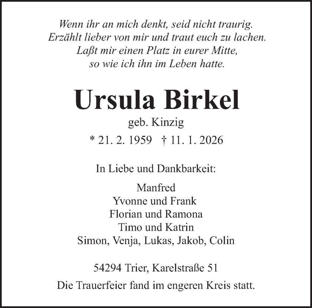 Hier finden Sie alle Traueranzeigen aus der Zeitung, die bisher für Ursula Birkel erschienen sind. Weitere Traueranzeigen, die in der Zeitung erscheinen, werden hier ebenfalls aufgelistet