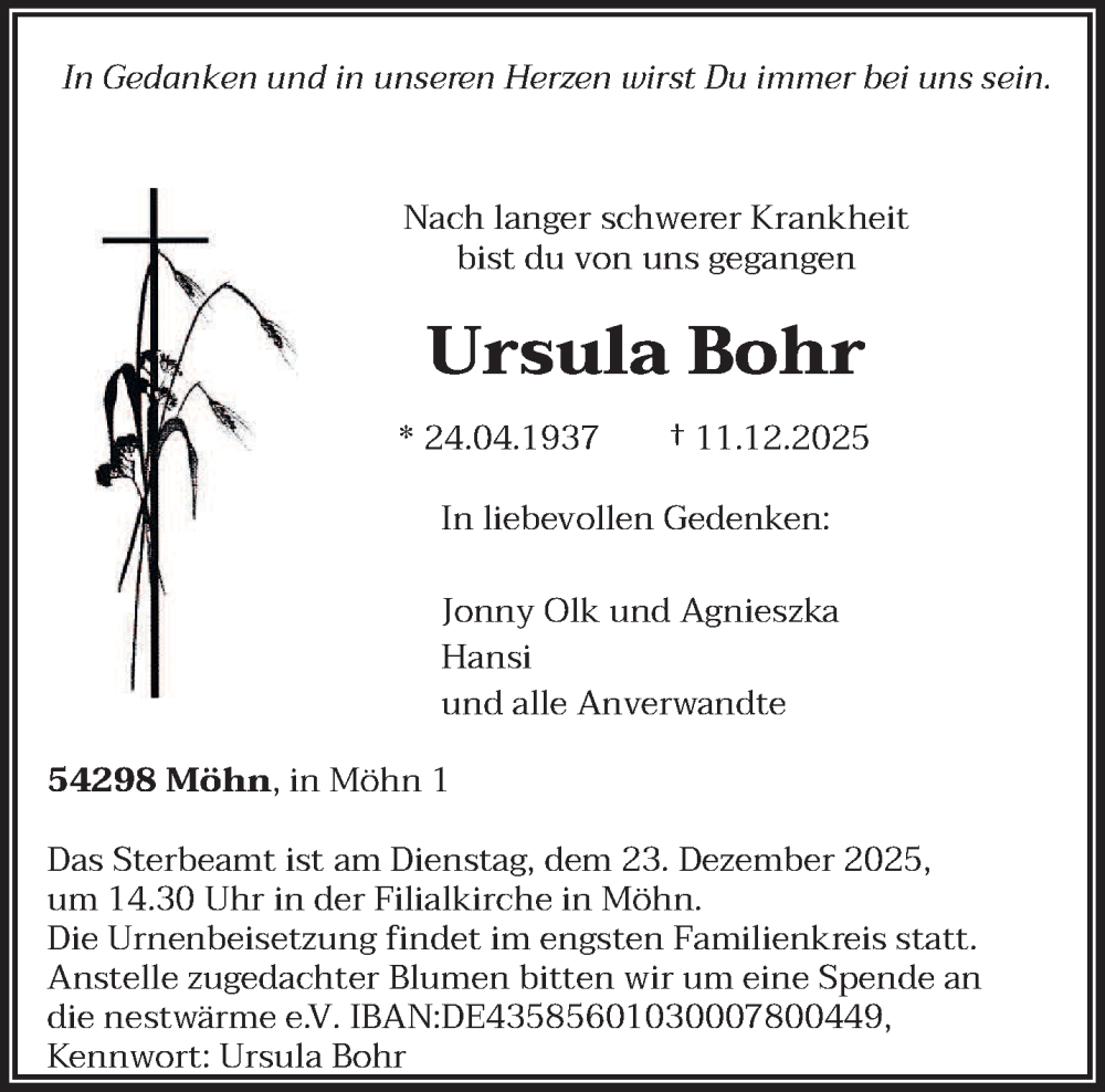 Hier finden Sie alle Traueranzeigen aus der Zeitung, die bisher für Ursula Bohr erschienen sind. Weitere Traueranzeigen, die in der Zeitung erscheinen, werden hier ebenfalls aufgelistet