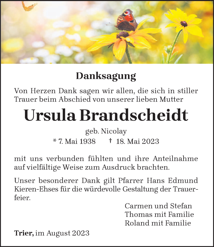 Hier finden Sie alle Traueranzeigen aus der Zeitung, die bisher für Ursula Brandscheidt erschienen sind. Weitere Traueranzeigen, die in der Zeitung erscheinen, werden hier ebenfalls aufgelistet
