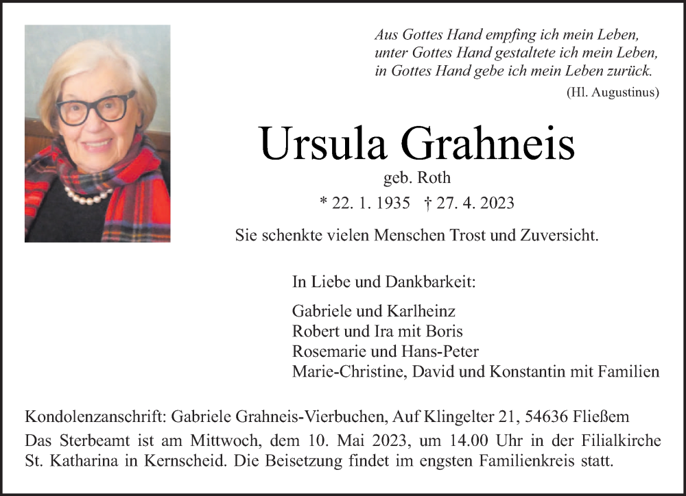 Hier finden Sie alle Traueranzeigen aus der Zeitung, die bisher für Ursula Grahneis erschienen sind. Weitere Traueranzeigen, die in der Zeitung erscheinen, werden hier ebenfalls aufgelistet