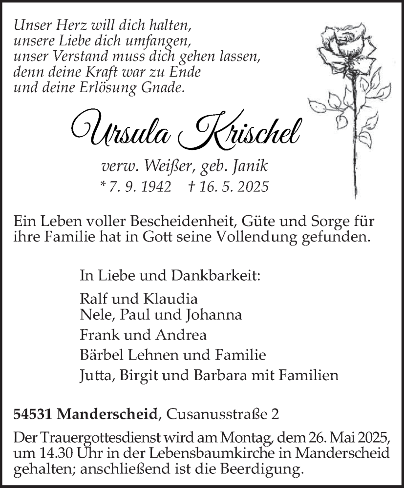 Hier finden Sie alle Traueranzeigen aus der Zeitung, die bisher für Ursula Krischel erschienen sind. Weitere Traueranzeigen, die in der Zeitung erscheinen, werden hier ebenfalls aufgelistet