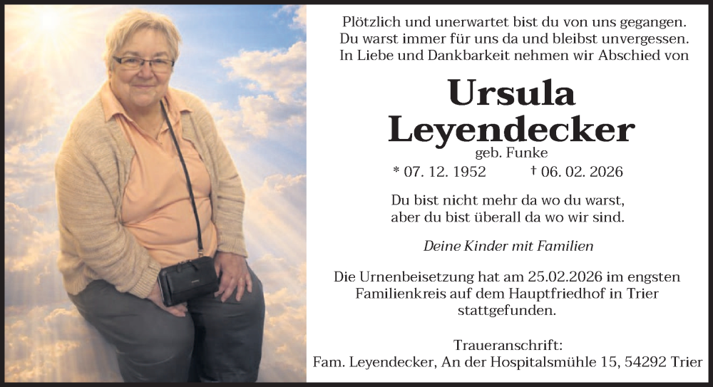 Hier finden Sie alle Traueranzeigen aus der Zeitung, die bisher für Ursula Leyendecker erschienen sind. Weitere Traueranzeigen, die in der Zeitung erscheinen, werden hier ebenfalls aufgelistet