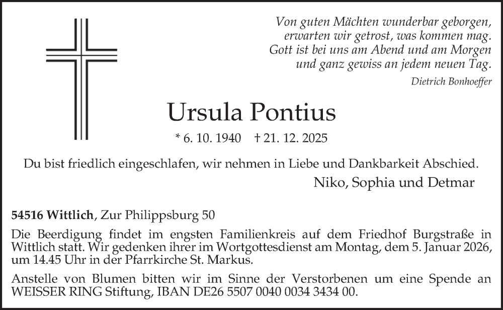 Hier finden Sie alle Traueranzeigen aus der Zeitung, die bisher für Ursula Pontius erschienen sind. Weitere Traueranzeigen, die in der Zeitung erscheinen, werden hier ebenfalls aufgelistet