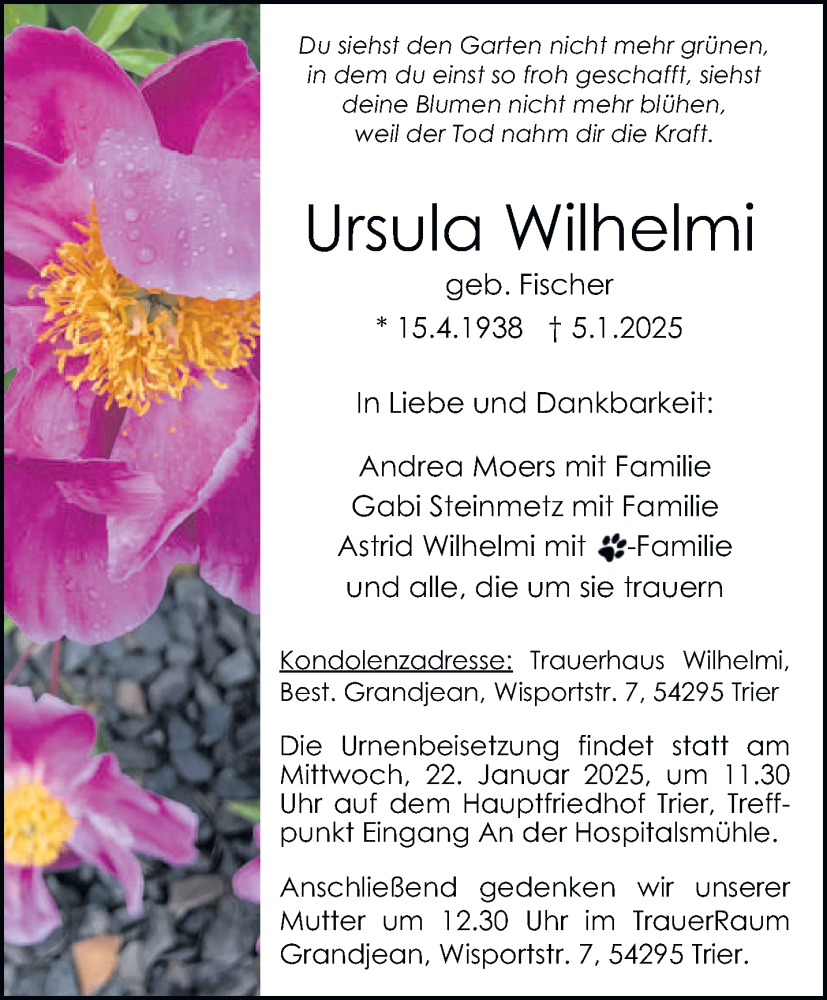 Hier finden Sie alle Traueranzeigen aus der Zeitung, die bisher für Ursula Wilhelmi erschienen sind. Weitere Traueranzeigen, die in der Zeitung erscheinen, werden hier ebenfalls aufgelistet