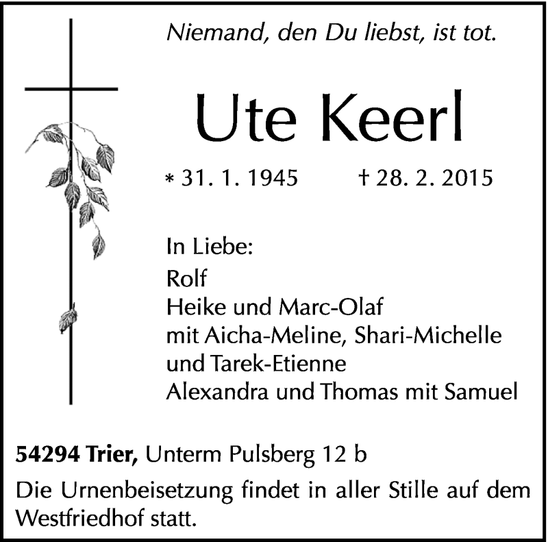 Hier finden Sie alle Traueranzeigen aus der Zeitung, die bisher für Ute Keerl erschienen sind. Weitere Traueranzeigen, die in der Zeitung erscheinen, werden hier ebenfalls aufgelistet