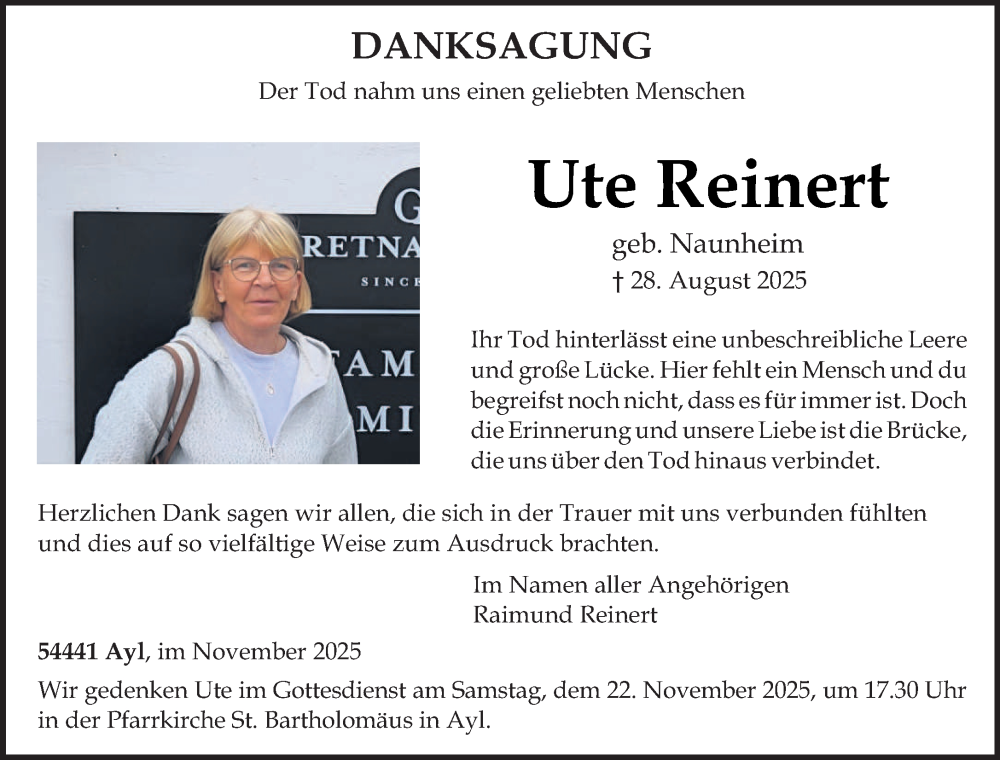Hier finden Sie alle Traueranzeigen aus der Zeitung, die bisher für Ute Reinert erschienen sind. Weitere Traueranzeigen, die in der Zeitung erscheinen, werden hier ebenfalls aufgelistet