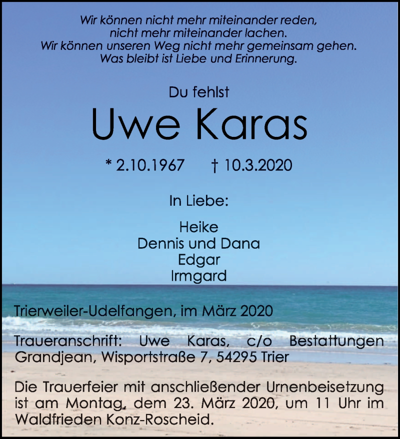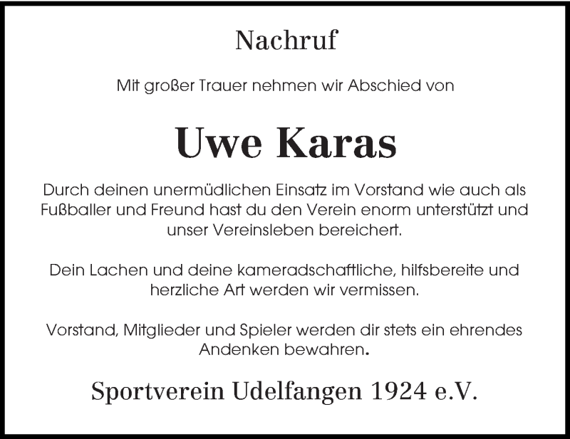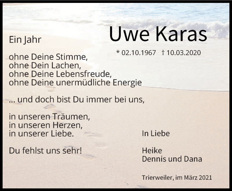 Hier finden Sie alle Traueranzeigen aus der Zeitung, die bisher für Uwe Karas erschienen sind. Weitere Traueranzeigen, die in der Zeitung erscheinen, werden hier ebenfalls aufgelistet