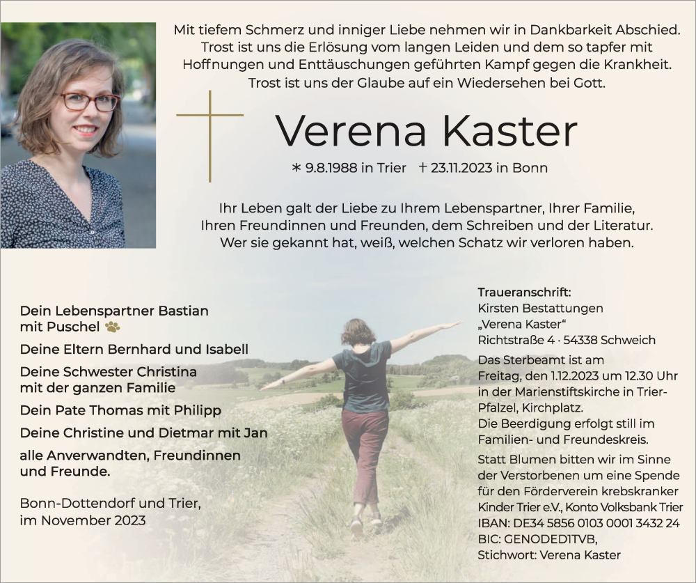 Hier finden Sie alle Traueranzeigen aus der Zeitung, die bisher für Verena Kaster erschienen sind. Weitere Traueranzeigen, die in der Zeitung erscheinen, werden hier ebenfalls aufgelistet