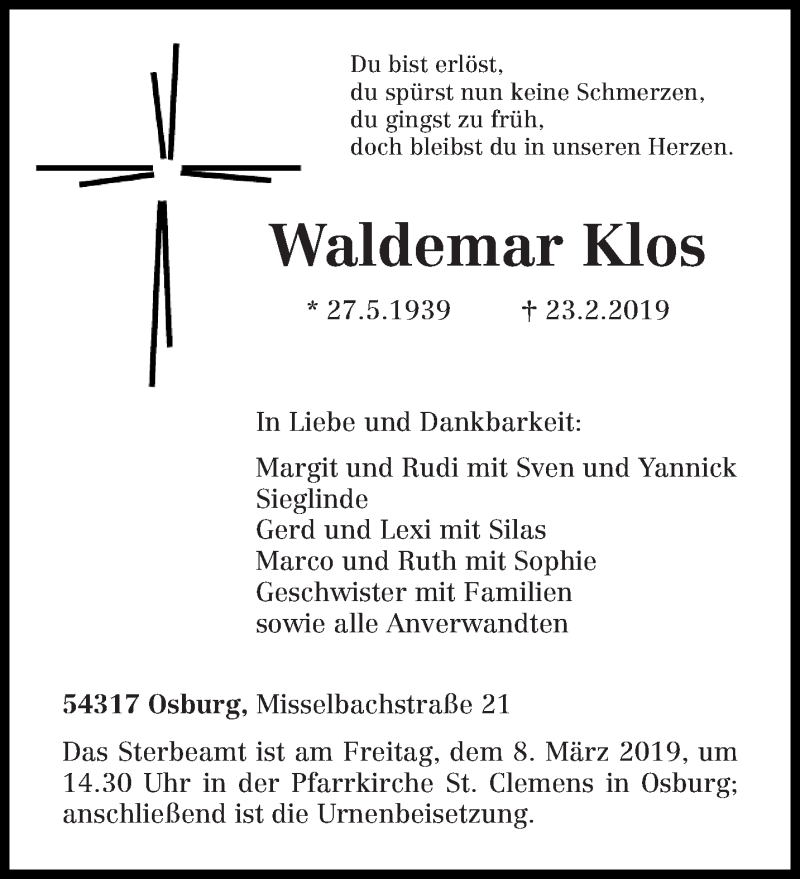 Hier finden Sie alle Traueranzeigen aus der Zeitung, die bisher für Waldemar Klos erschienen sind. Weitere Traueranzeigen, die in der Zeitung erscheinen, werden hier ebenfalls aufgelistet