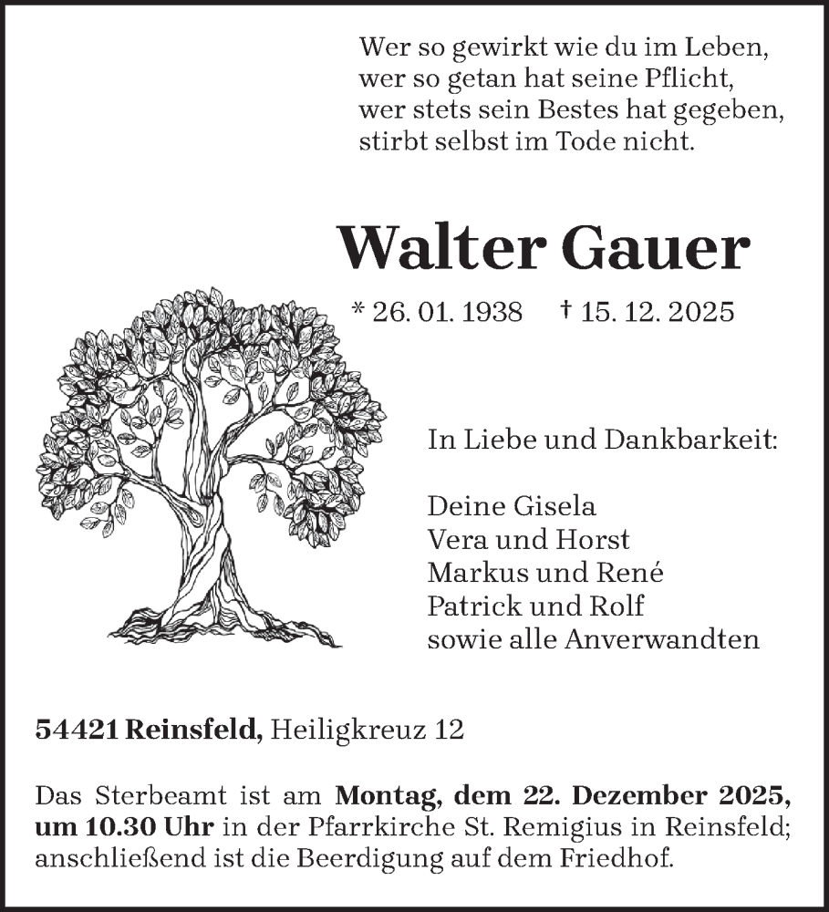 Hier finden Sie alle Traueranzeigen aus der Zeitung, die bisher für Walter Gauer erschienen sind. Weitere Traueranzeigen, die in der Zeitung erscheinen, werden hier ebenfalls aufgelistet