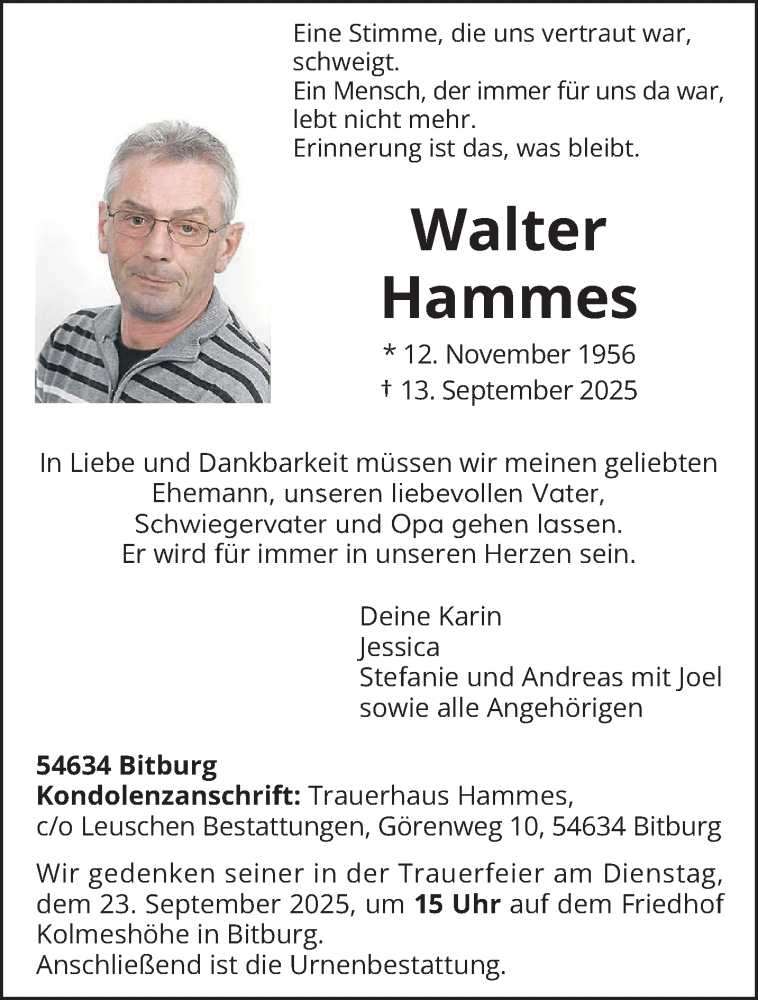 Hier finden Sie alle Traueranzeigen aus der Zeitung, die bisher für Walter Hammes erschienen sind. Weitere Traueranzeigen, die in der Zeitung erscheinen, werden hier ebenfalls aufgelistet