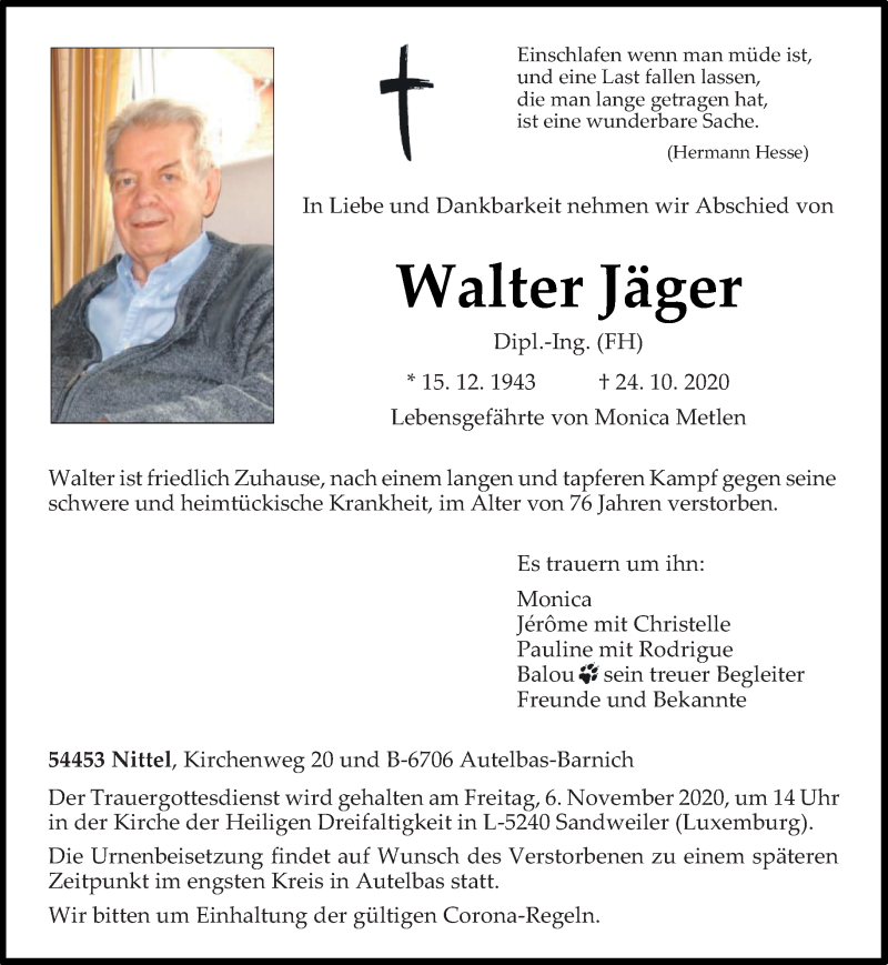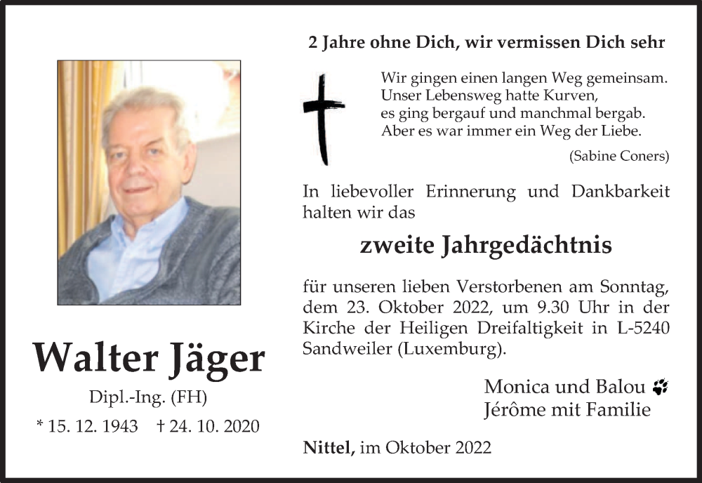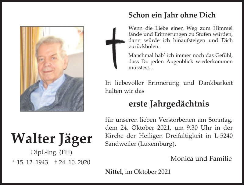 Hier finden Sie alle Traueranzeigen aus der Zeitung, die bisher für Walter Jäger erschienen sind. Weitere Traueranzeigen, die in der Zeitung erscheinen, werden hier ebenfalls aufgelistet