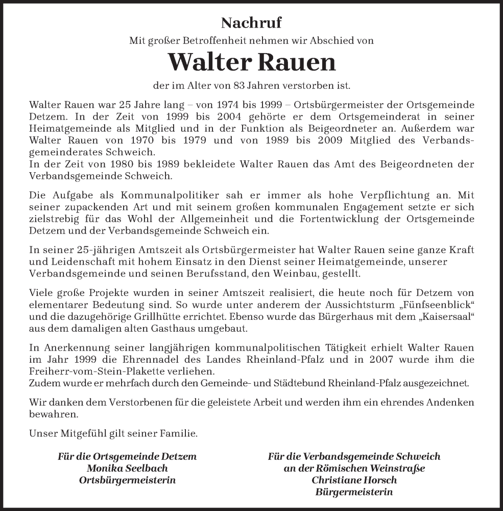 Hier finden Sie alle Traueranzeigen aus der Zeitung, die bisher für Walter Rauen erschienen sind. Weitere Traueranzeigen, die in der Zeitung erscheinen, werden hier ebenfalls aufgelistet