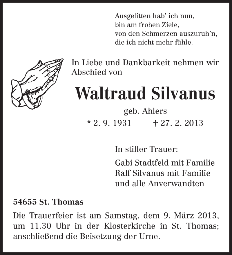Hier finden Sie alle Traueranzeigen aus der Zeitung, die bisher für Waltraud Silvanus erschienen sind. Weitere Traueranzeigen, die in der Zeitung erscheinen, werden hier ebenfalls aufgelistet