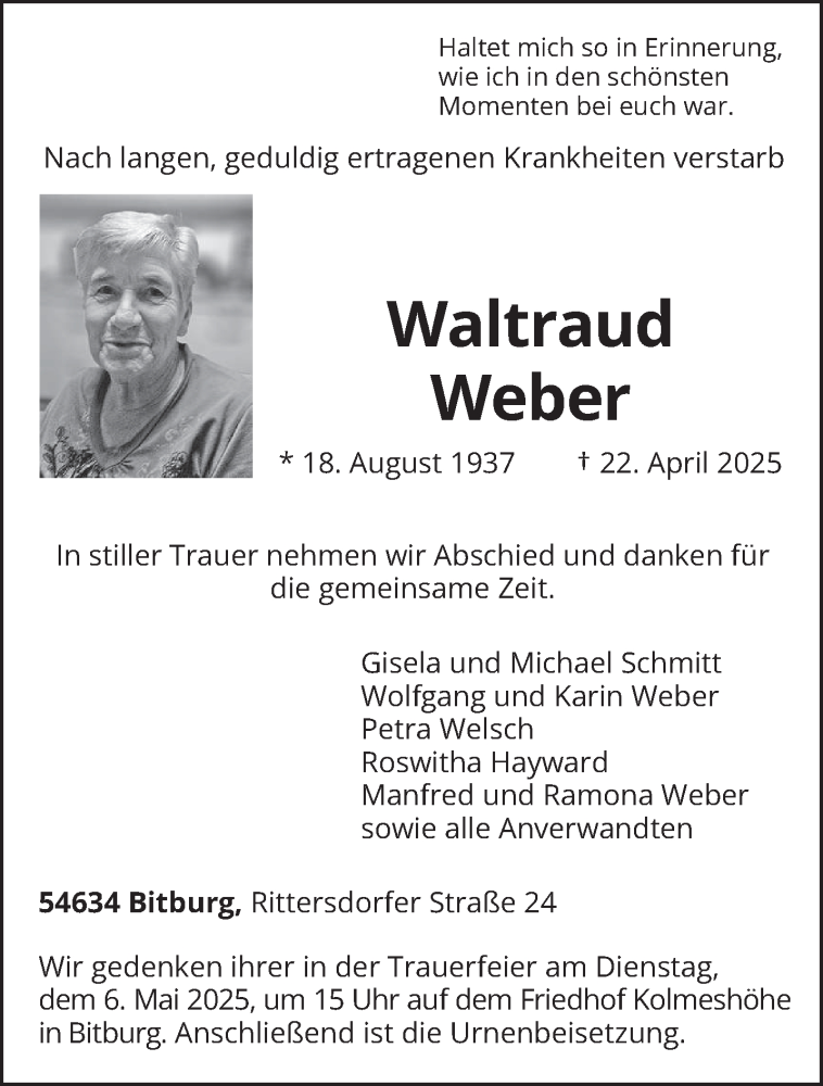 Hier finden Sie alle Traueranzeigen aus der Zeitung, die bisher für Waltraud Weber erschienen sind. Weitere Traueranzeigen, die in der Zeitung erscheinen, werden hier ebenfalls aufgelistet