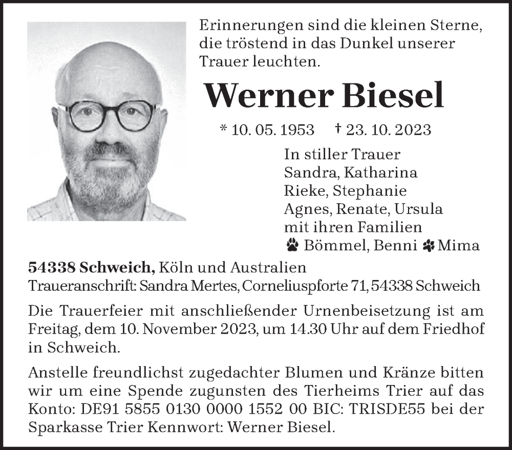 Hier finden Sie alle Traueranzeigen aus der Zeitung, die bisher für Werner Biesel erschienen sind. Weitere Traueranzeigen, die in der Zeitung erscheinen, werden hier ebenfalls aufgelistet